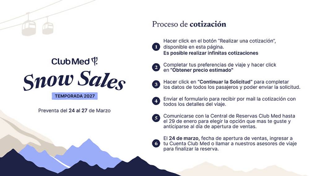 No dudes en acceder a tu Cuenta Club Med para ahorrar tiempo completando el formulario y asegurate hasta un 20% de descuento el día de apertura de ventas. Podras encontrar tu pedido de cotización directamente en tu Cuenta Club Med.
